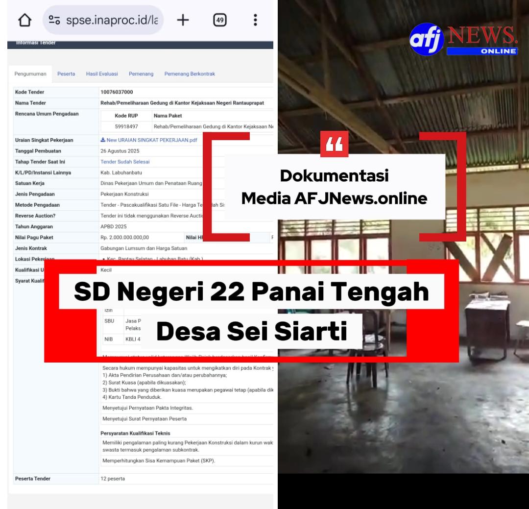 LABUHANBATU AFJNews.online – Menyakitkan mata, Kontras tajam terlihat dalam alokasi anggaran pembangunan di Kabupaten Labuhan Batu, Sumatera Utara. Sementara SD Negeri 22 Panai Tengah di Desa Sei Siarti, Kecamatan Panai Tengah, Kabupaten Labuhan Batu terus mengalami kerusakan yang bertambah parah, dapat membahayakan keselamatan siswa dan guru dalam kegiatan belajar mengajar, kantor Kejaksaan Negeri (Kejari) Rantau Prapat tahun 2024 sudah mendapat dana hibah Rp 2 Miliar, kembali tahun 2025 ini mendapat dana hibah Rp 2 Miliar untuk Rehap/ Pemeliharaan Gedung di Kantor Kejaksaan Negeri Rantau Prapat dari APBD Pemda Labuhan Batu. Kode RUP : 59918497.