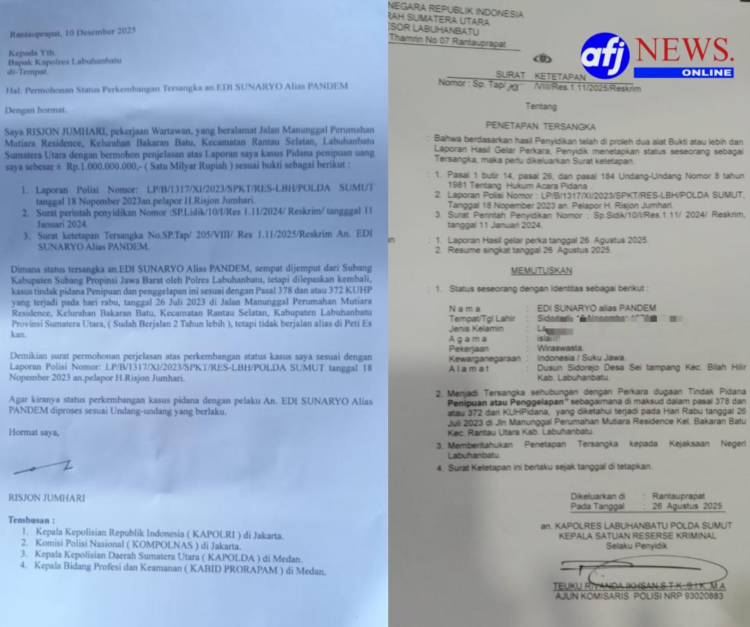 Labuhanbatu, AFJNews.Online – Kasus penipuan yang menimpa Risjon Jumhari, seorang wartawan media online REALITA. Com, menjadi sorotan tajam. Lebih dari dua ( 2 ) tahun berlalu, namun proses hukum terhadap tersangka Edi Sunaryo alias PANDEM terkesan mangkrak, jelas hal ini memicu pertanyaan besar tentang kinerja oknum Juru Periksa ( Juper ) – Penyidik – Polres Labuhan Batu yang menangani kasus ini.