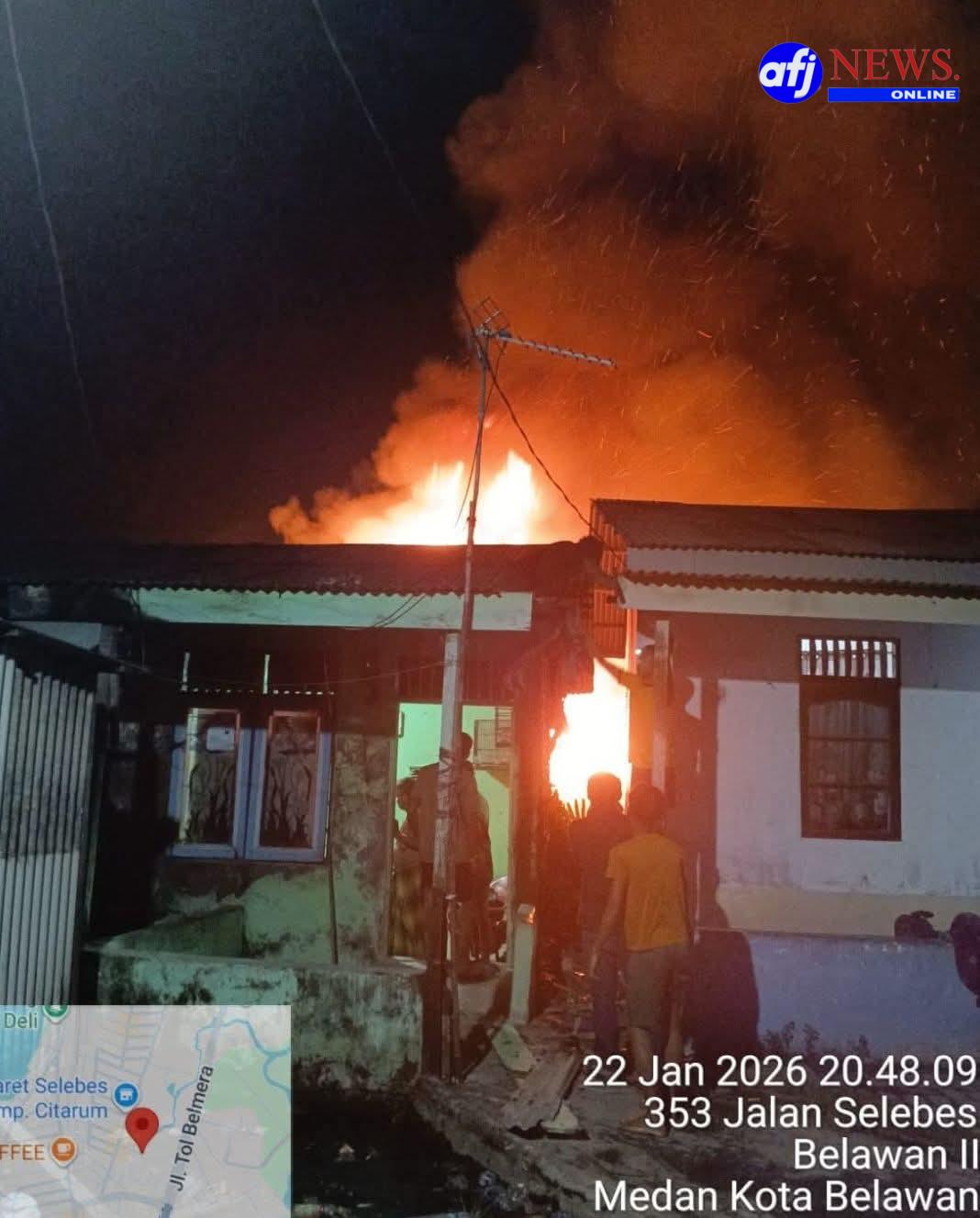 BELAWAN, AFJNews.online – Dampak kebakaran hebat kembali melanda pemukiman padat penduduk di Jl. Selebes Lingkungan 30, Gang 15, Kel, Belawan II, Kec, Medan Belawan, Kota Medan, pada Kamis malam 22 Januari 2026, dini hari tadi. Api dengan cepat melahap enam unit rumah warga yang sebagian besar terbuat dari material kayu dan semi-permanen, sehingga kobaran api meluas dalam hitungan menit. Kamis, (22/1/2026)