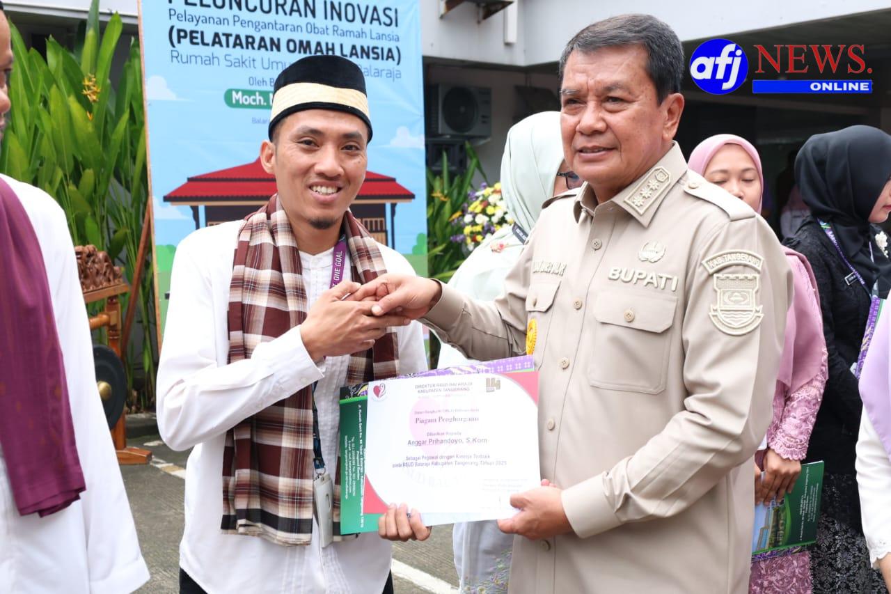 Tangerang, AFJNews.online — Bupati Tangerang, Moch Maesyal Rasyid menghadiri apel pagi dalam rangka HUT ke-14 RSUD Balaraja yang dirangkaikan dengan peluncuran inovasi Pelayanan Pengantaran Obat Ramah Lansia (Pelatran Omah Lansia) dan pemberian santunan kepada anak yatim. Acara tersebut dilaksanakan di Halaman RSUD Balaraja, Selasa (23/9/25)