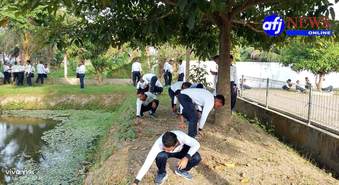 Usai pelaksanaan apel, kegiatan dilanjutkan dengan kerja bakti pembersihan area benteng kolam yang dipadukan dengan penanaman rumput sebagai bagian dari penataan kawasan. Setiap sudut dibersihkan dengan penuh kepedulian, sementara hamparan rumput yang ditanam menjadi simbol awal kehidupan baru yang lebih hijau dan tertata. Upaya ini tidak hanya memperindah lingkungan, tetapi juga menjadi fondasi penting dalam pengembangan area tersebut sebagai sarana pendukung ketahanan pangan yang berkelanjutan.