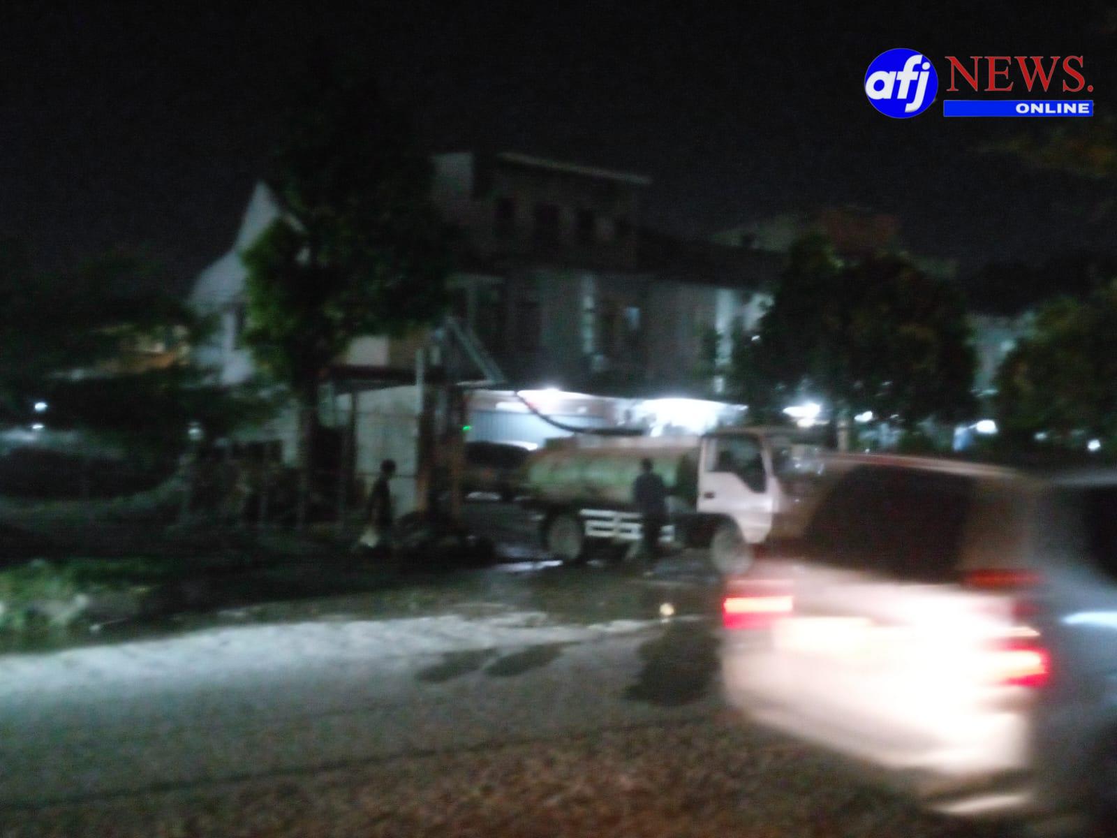 Kegiatan pengisian air yang dilakukan oleh mobil tangki air dipinggir jalan. yang mengakibatkan jalan tergenang air, dan dapat membahayakan pengguna kendaraan bermotor tersebut, sudah lama beroperasi.