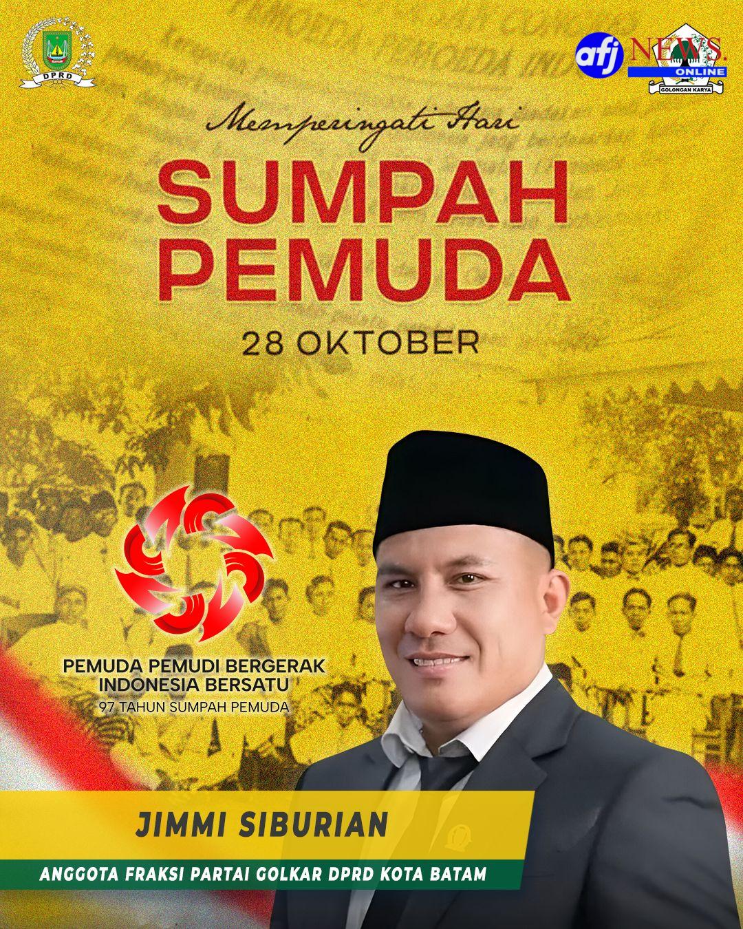 Batam, AFJNews.Online – Dalam rangka memperingati Hari Pancasila, Jimmy Siburian, anggota Fraksi Partai Golkar, menyampaikan ucapan selamat kepada seluruh rakyat Indonesia. Beliau menekankan pentingnya Pancasila sebagai landasan dalam membangun bangsa dan negara yang kuat dan sejahtera. Selasa (28/10/2025)