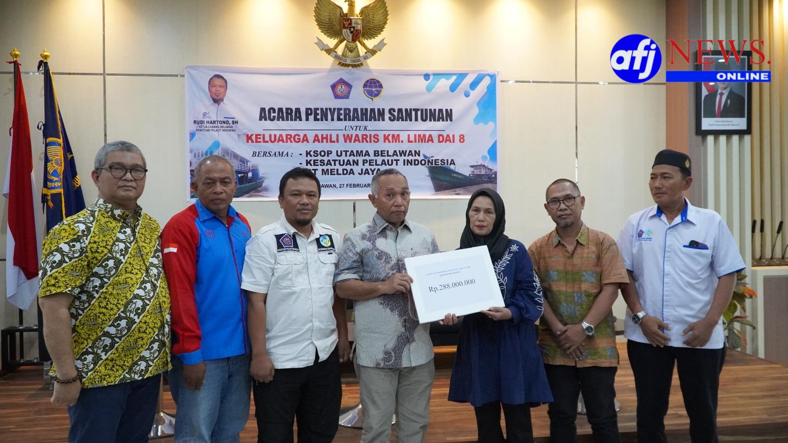 Santunan ini diberikan langsung kepada istri korban, disaksikan Kepala KSOP Belawan, Ketua Kesatuan Pelaut Indonesia dan Pimpinan PT Melda Jaya.