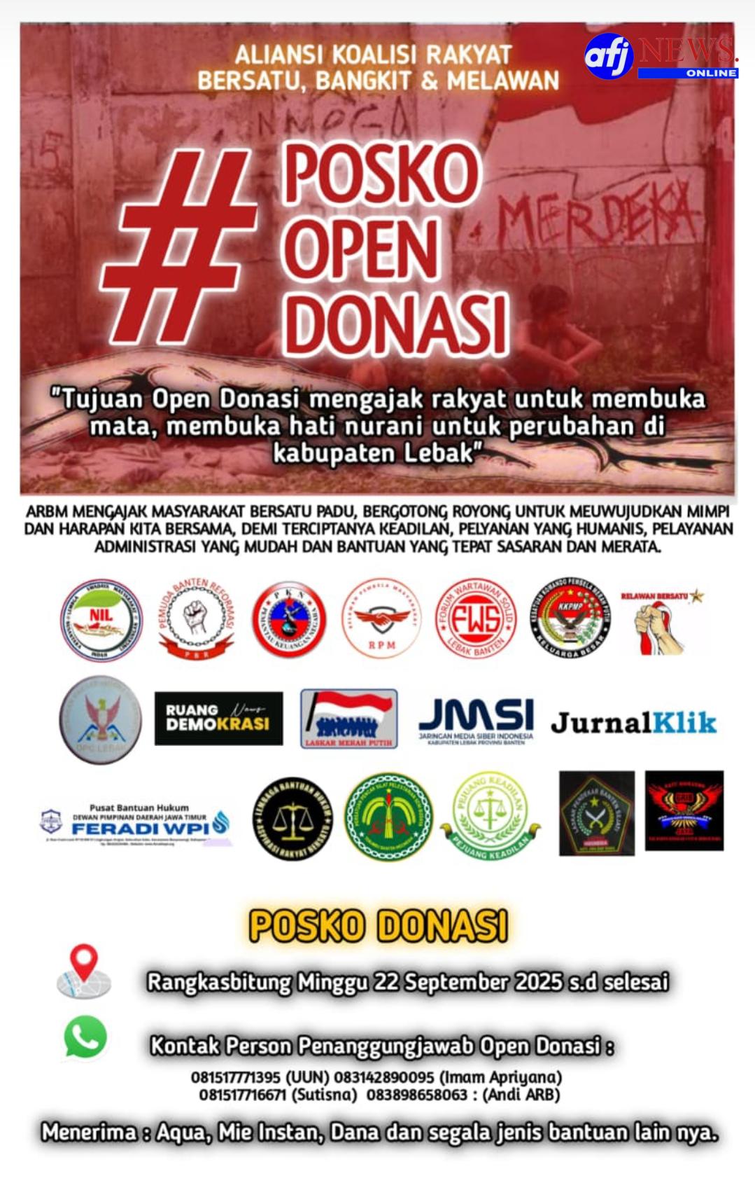 LEBAK, AFJNews.online – Seruan Open Donasi yang digagas Koalisi Rakyat Bersatu Melawan (ARBM) bukan sekadar aksi solidaritas sosial, melainkan juga bentuk perlawanan terhadap berbagai persoalan akut di Kabupaten Lebak. Donasi ini, diharapkan mampu mengetuk nurani masyarakat sekaligus membuka mata atas deretan ketidakadilan yang masih menghantui rakyat kecil.