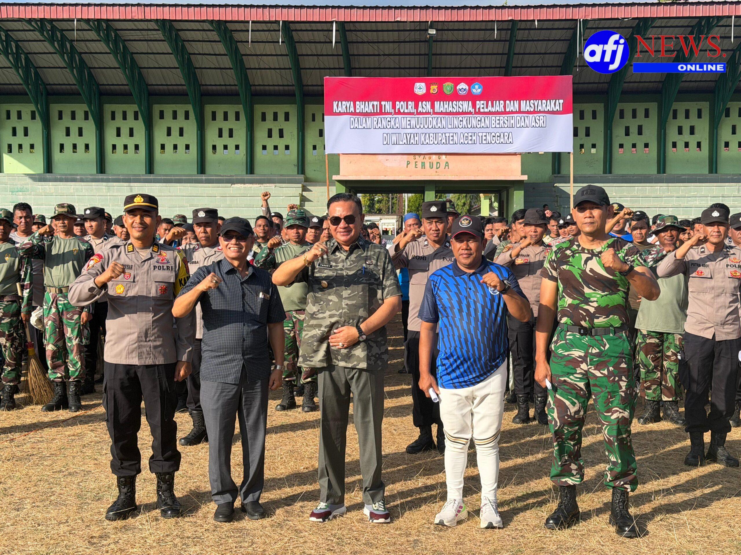 Aceh Tenggara, AFJNews.online – Dalam rangka mewujudkan lingkungan yang bersih dan asri di wilayah Kabupaten Aceh Tenggara, dilaksanakan kegiatan karya bakti yang melibatkan unsur TNI, Polri, ASN, mahasiswa, pelajar, serta masyarakat setempat. Kegiatan gotong royong ini dipusatkan di seputaran Lapangan Pemuda, yang merupakan salah satu sarana olahraga yang kerap dimanfaatkan warga. 13 Februari 2026