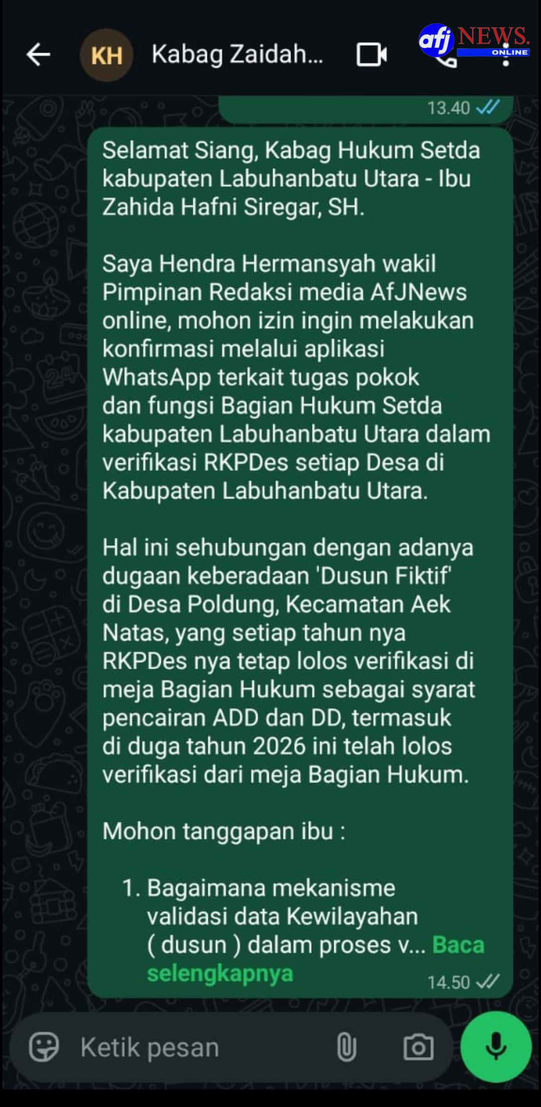 Sorotan tajam kini mengarah pada kinerja Bagian Hukum yang di kepalai oleh Zahida Hafni Siregar, SH yang secara konsisten meloloskan Rencana Kerja Pemerintah Desa (RKPDes) Poldung dalam proses verifikasi tahunan. Padahal, secara faktual keberadaan fisik dan administratif Dusun 1 Poldung tersebut terus dipertanyakan oleh publik, awak media dan LSM Labura.