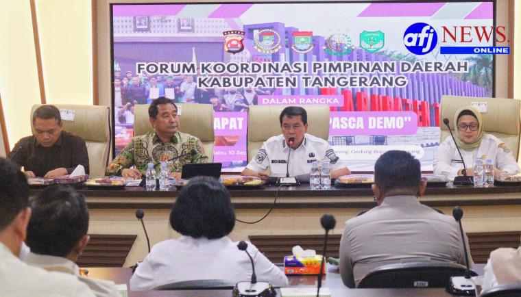 TANGERANG, AFJNews.online – Pemerintah Kabupaten (Pemkab) Tangerang menggelar rapat koordinasi bersama Forum Koordinasi Pimpinan Daerah (Forkopimda) Kabupaten Tangerang pasca terjadinya aksi demonstrasi di sejumlah wilayah dan perkembangan yang terus berkembang saat ini. Rapat ini berlangsung di Ruang Rapat Wareng, Gedung Bupati Tangerang, Rabu (10/9/2025).