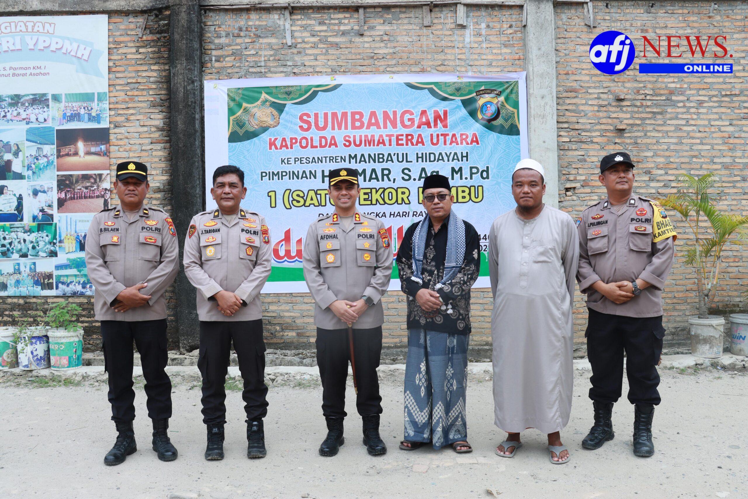 ASAHAN, AFJnews.online – 6 Juni 2025 Dalam rangka menyambut Hari Raya Idul Adha 1446 H. Kapolda Sumatera Utara memberikan sumbangan satu ekor lembu sebagai hewan qurban. Hewan qurban tersebut secara resmi diserahkan oleh Kapolres Asahan AKBP Afdhal Junaidi kepada Pimpinan Yayasan Pondok Pesantren Manba’ul Hidayah yang berlokasi di Kabupaten Asahan.