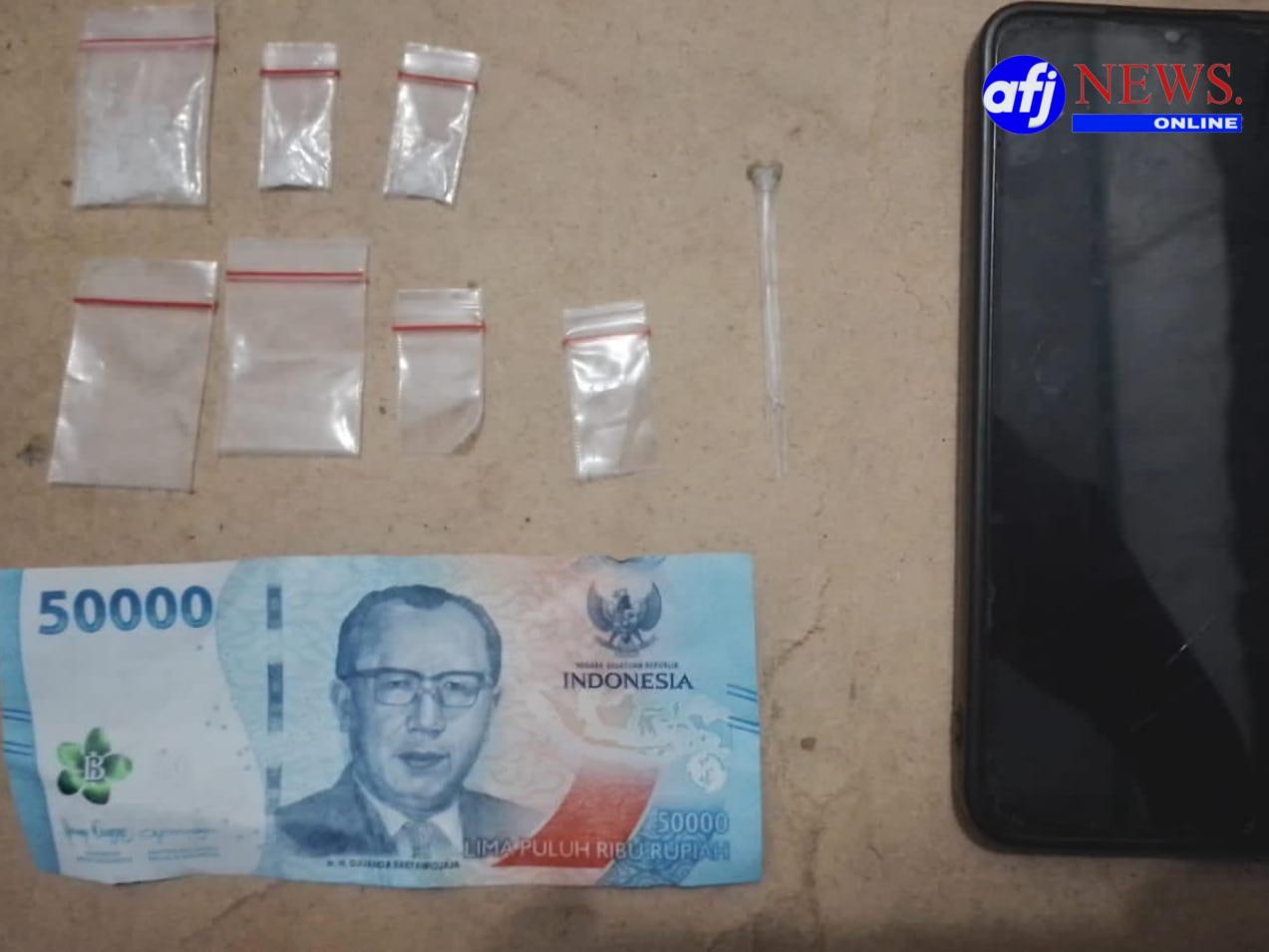 Dari tangan tersangka, petugas mengamankan 3 plastik klip berisi shabu, 4 plastik klip kosong, 1 buah pipet ujung runcing, 1 unit handphone, serta uang tunai sebesar Rp 50.000,-.