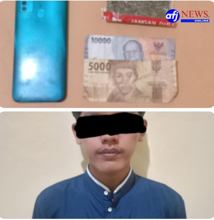 Dari hasil penggeledahan, petugas mengamankan barang bukti berupa 1 bungkus plastik bening berisi daun kering yang diduga ganja dengan berat netto sekitar 3,89 gram, 1 unit handphone merek Infinix warna hijau tosca, serta uang tunai sebesar Rp15.000 yang diduga hasil penjualan.