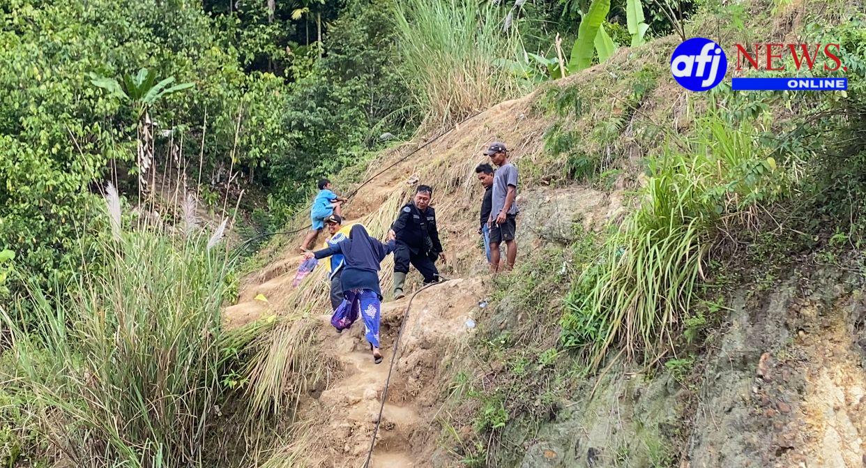 Dalam kondisi sulit itu, Ipda Patar Erwinsyah Nababan terlihat turun langsung mendampingi dan membantu masyarakat menempuh jalur terjal tersebut. Dengan penuh kepedulian, ia membantu warga membawa barang bawaan dan memastikan keselamatan para lansia, ibu-ibu, serta anak-anak selama perjalanan melewati jalur pendakian darurat.