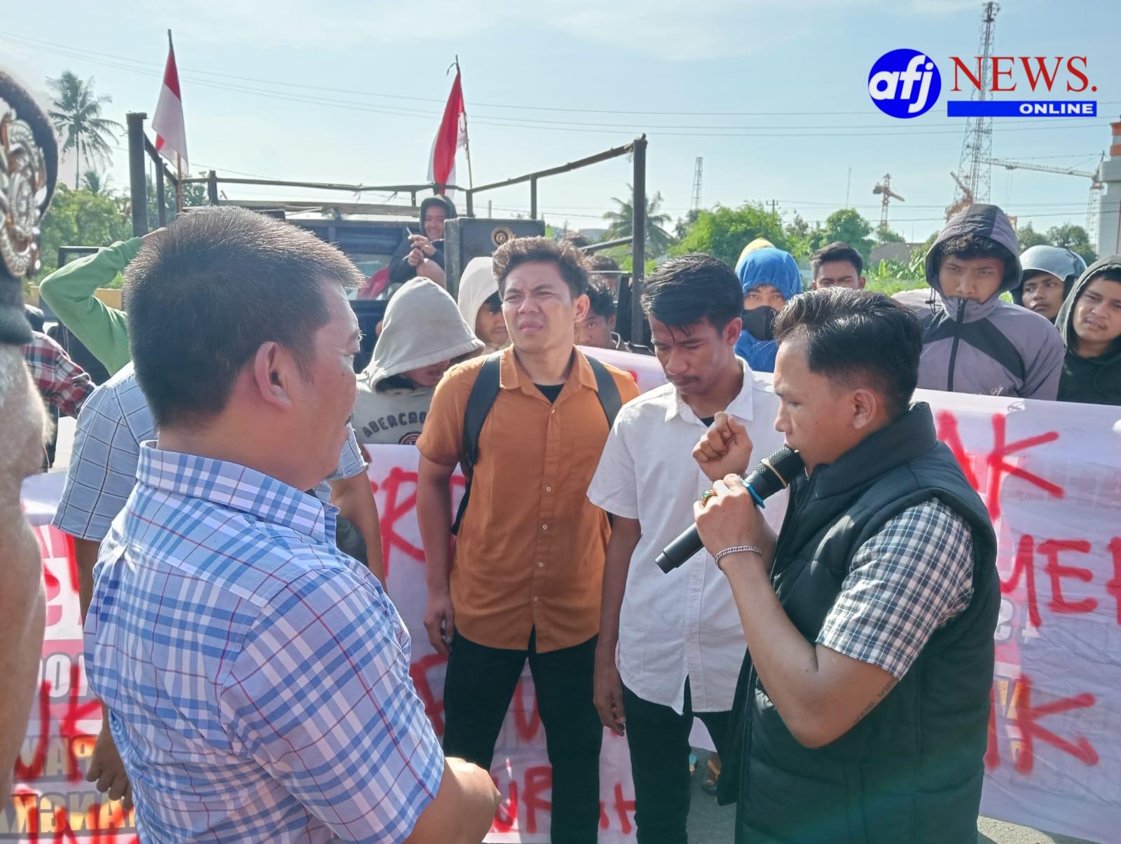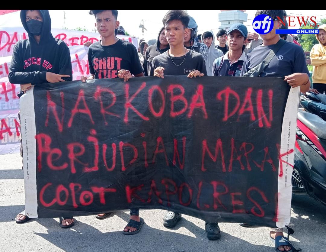 Pantauan di lokasi, massa membawa sejumlah spanduk berisi tuntutan yang ditulis menggunakan cat semprot merah. Salah satu spanduk utama bertuliskan, “Narkoba dan Perjudian Marak, Copot Kapolres!”.